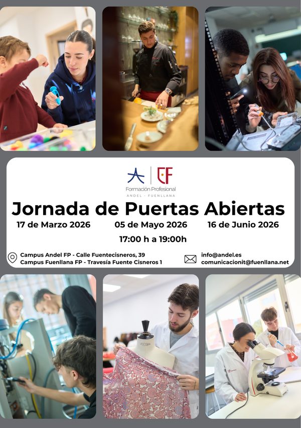 En Andel Formación Profesional estamos preparando con mucha ilusión nuestras próximas Jornadas de Puertas Abiertas, una oportunidad única para conocer de cerca nuestro proyecto educativo, nuestras instalaciones y el ambiente que se vive día a día en el centro.